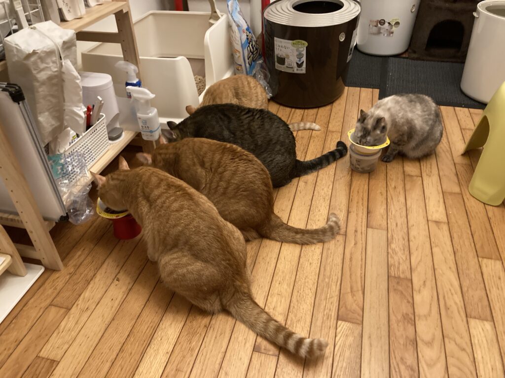 帰宅すると、猫たちが「お腹すいたよ~!」と大合唱でお出迎え🐾💕