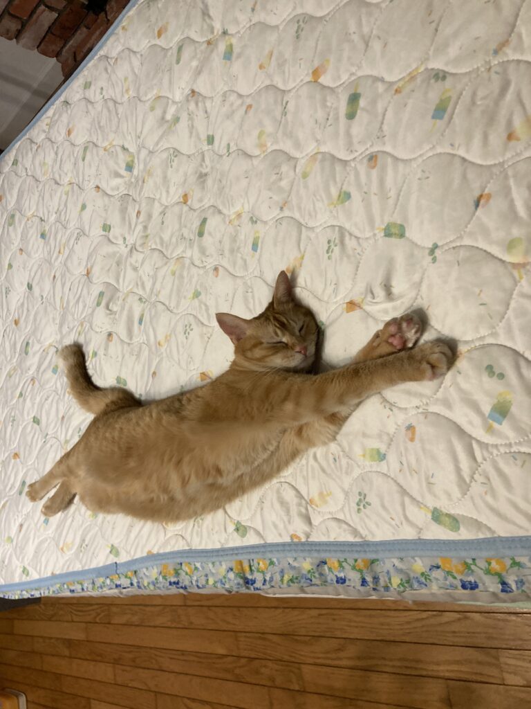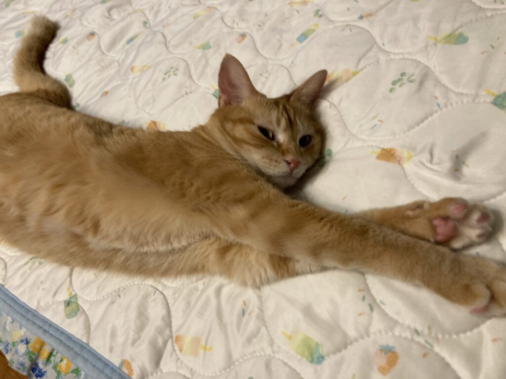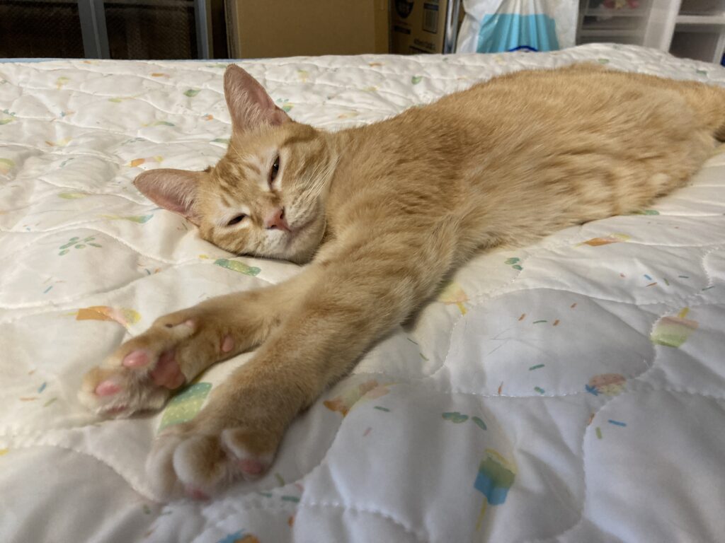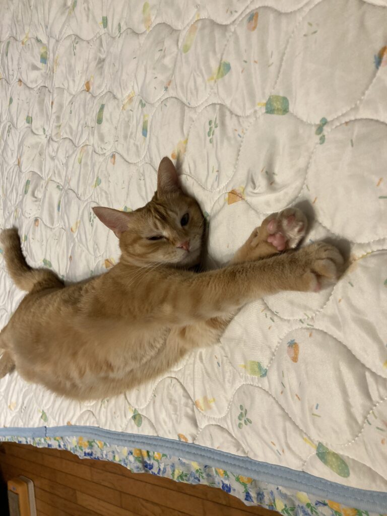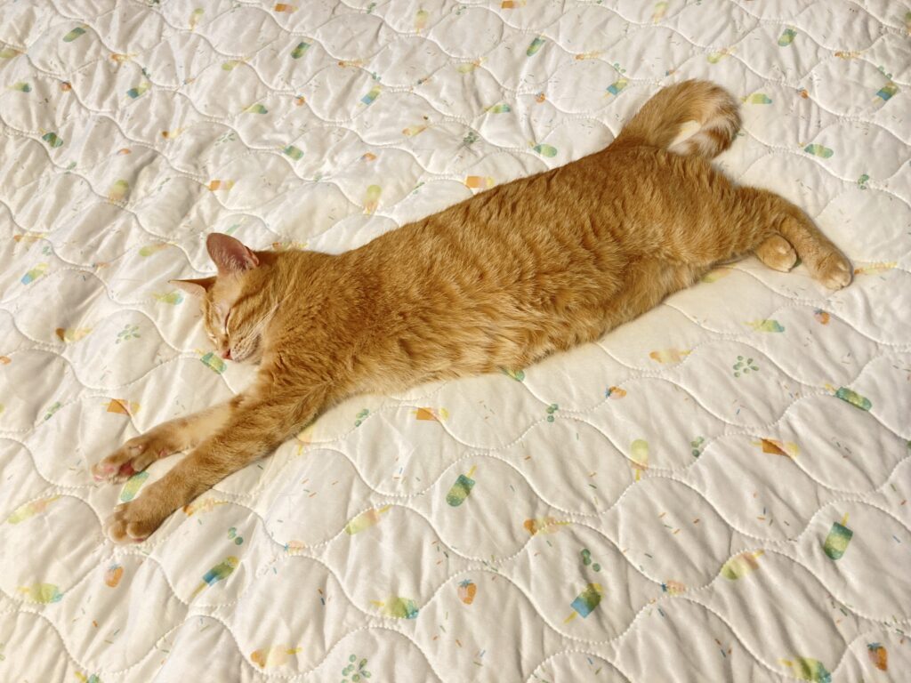 猫は寝るときに仰向けで手足を伸ばすことがあります。安心してリラックスできている証拠✨
