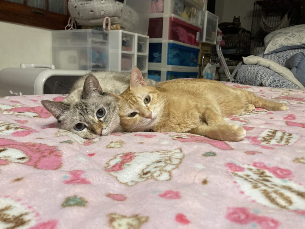 シナモン母さんとももちゃんの仲良しお昼寝風景をお届けします🐱🌸